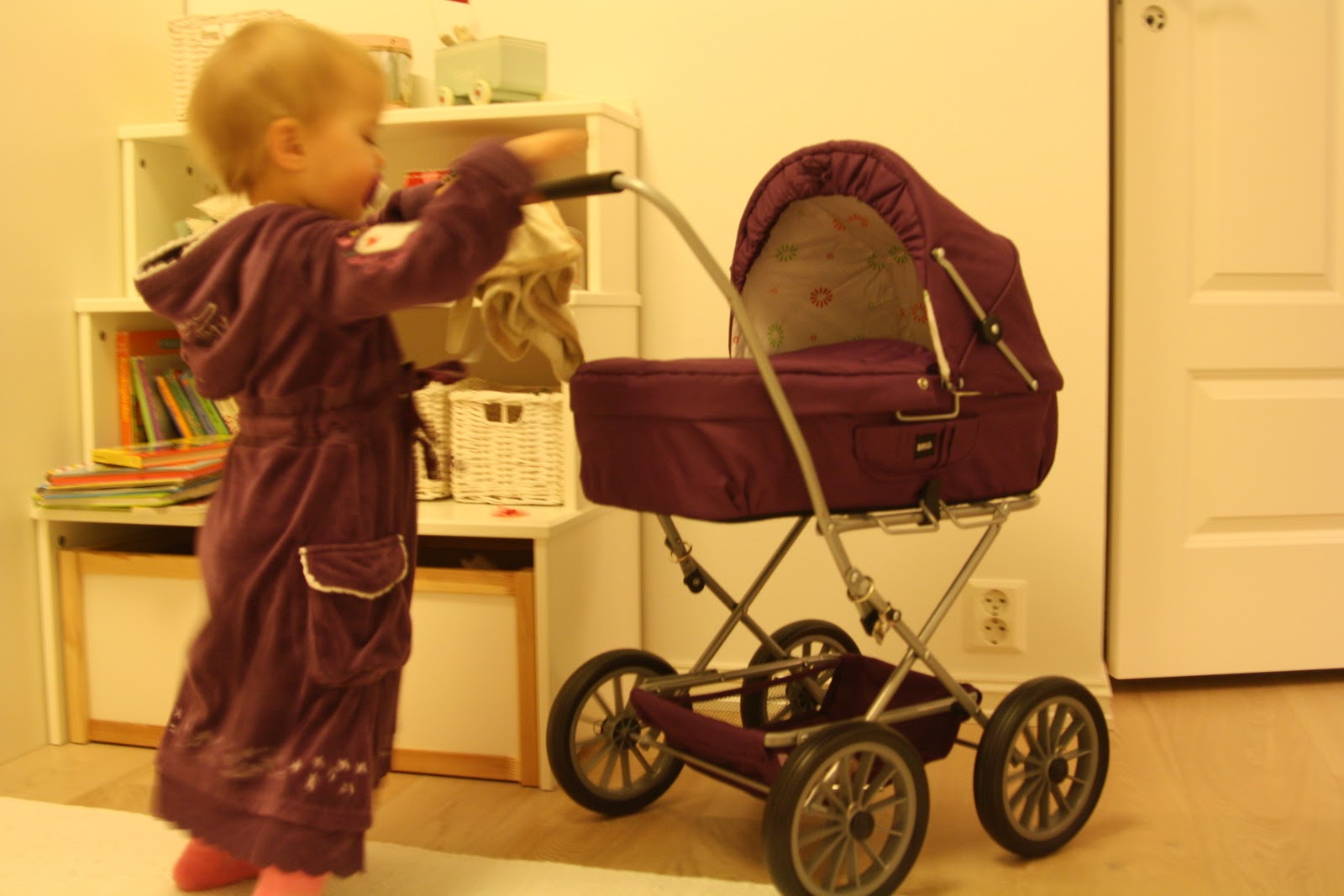Så fin hun er og fin vogn. Det er så gøy når barna får leker de virkelig liker, og du ser de bare lyser opp. Jeg har to gutter, og måtte bare ta ned min gamle vogn fra loftet en dag, og toåringen min koste seg med dukke og vogn hele dagen. Kjempesøt.